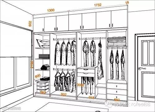 一般来说,衣柜的每个储衣空间都是有尺寸上的讲究的。据设计师介绍,挂短衣或上装的空间高度不低于800mm;挂长大衣的高度不低于1400mm;抽屉的高度不低于150mm~200mm。