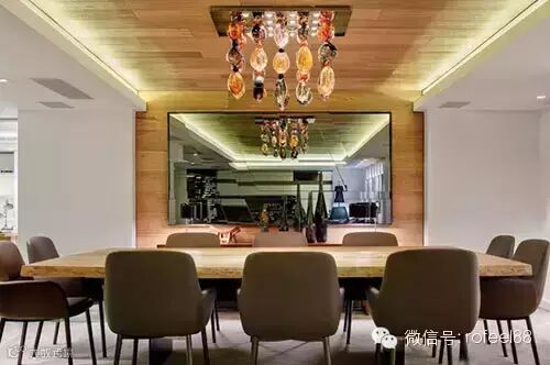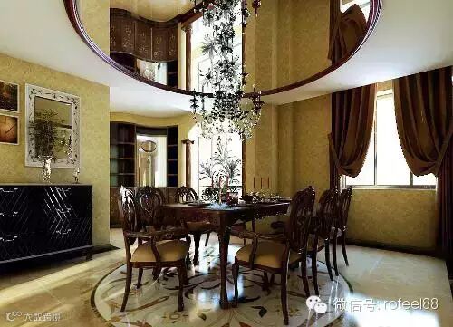 吊顶上方采用镜面装饰会让空间延展一倍,让人产生上方还有一层楼的感觉, 借助吊顶上的灯光让空间更显敞亮。需要注意的是吊顶上方的整块镜面的面积不宜过大,可以在中间重要区域采用镜面,其他位置用正常吊顶即可。如果希望全部的吊顶都采用的话,建议采用小镜面拼接的样式,将吊顶分隔为一个个小区域,这样可以避免因过度使用镜面而让人产生扭曲的错觉和光污染。
