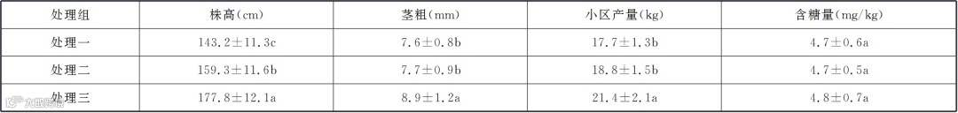 2) 处理三的植株茎粗比处理一增加17.1%,比处理二增加15.6%。