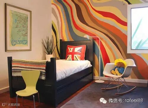 彩色条纹给人缤纷的色彩,这样的不规则曲线色条带来的是一种流动的明媚感,想要家变得更多彩,设计这样的背景墙是值得采纳的。