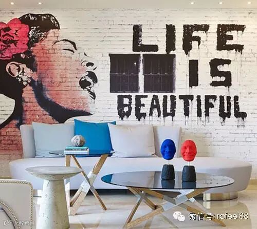 这款背景墙是由砖块砌起来的,上面涂鸦的这位呐喊的女性形象极具震撼力,并且很好地运用了窗户这个元素,好像压抑的愤怒想要宣泄出来,让墙面具有了故事性。