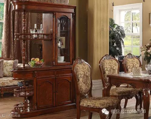 美式风格的隔断酒柜,酒柜上有优雅的雕刻,流畅的线条,采用的是天然的胡桃木或枫木等材料,制造工艺精良。给人以古朴华美的感觉。