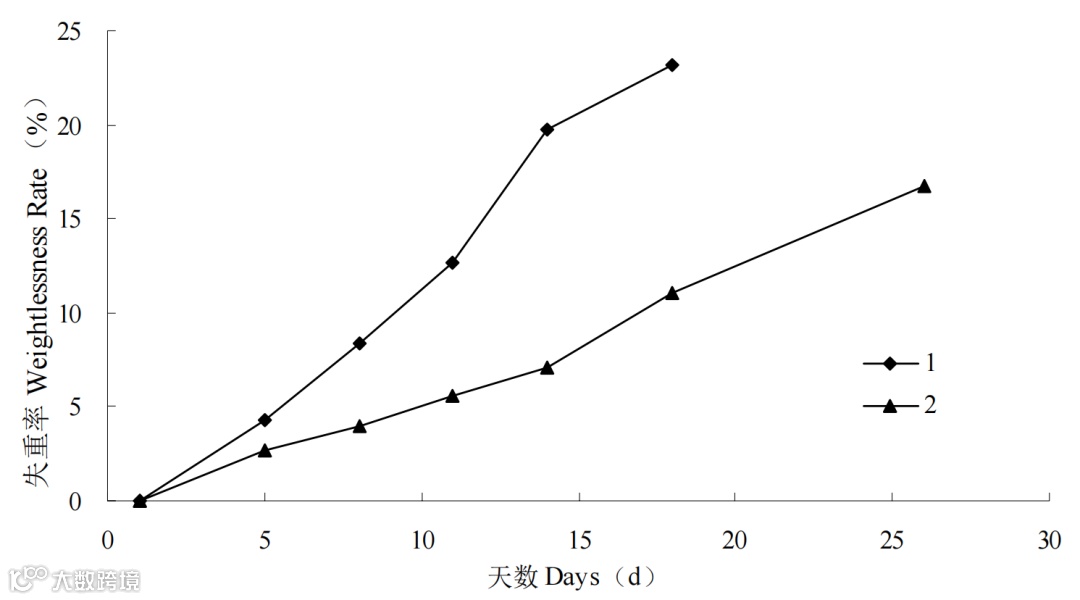 图 2 不同温度下莲雾果实失重率的变化(1:常温(25℃) 2:低温 (5℃))