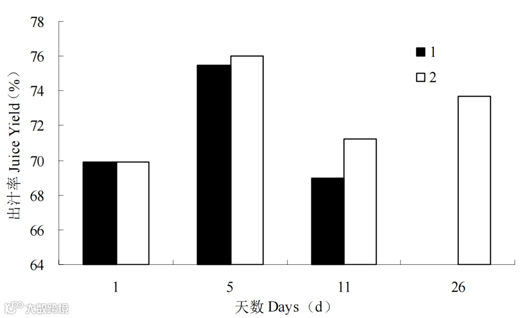 图 3 不同温度下莲雾果实出汁率的变化(1:常温(25℃) 2:低温 (5℃))