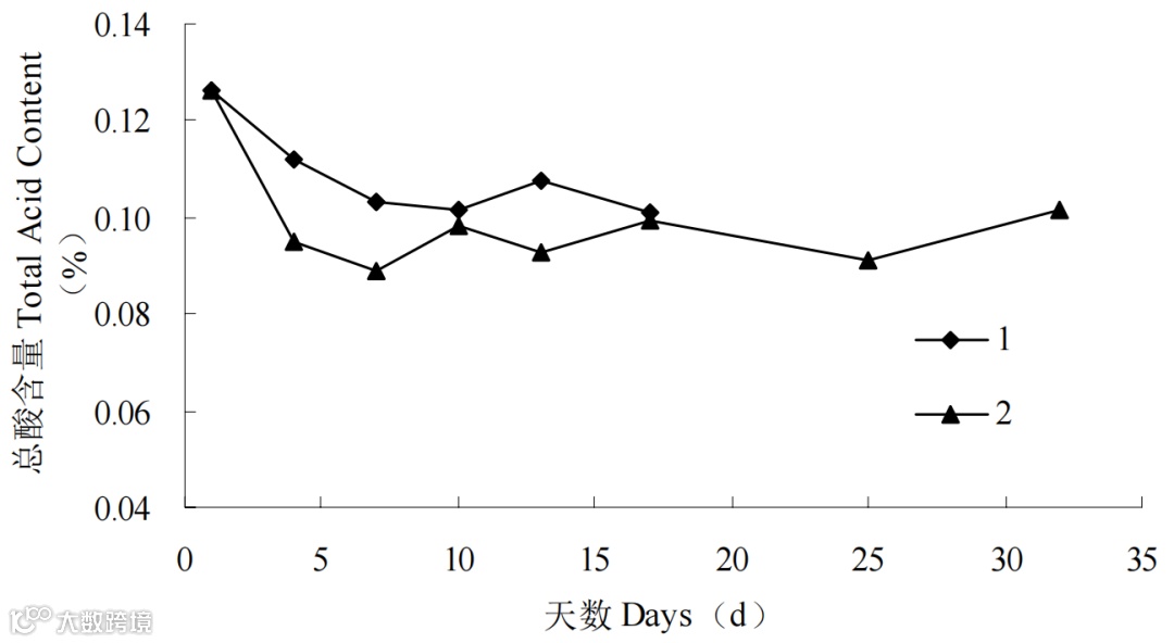 图 5 不同温度下莲雾果实中总酸含量的变化(1:常温 (25℃) 2:低温 (5℃))