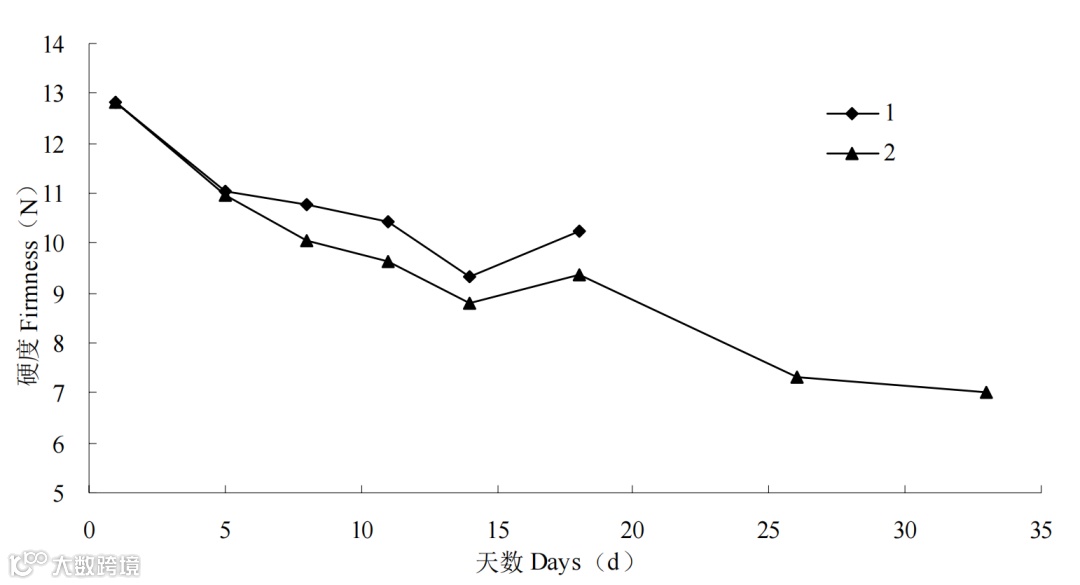 图 1 不同温度下莲雾果肉硬度的变化(1:常温(25℃) 2:低温 (5℃))