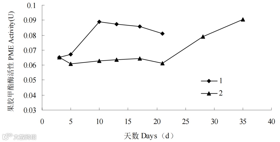 图 9 不同温度下莲雾果实果胶甲酯酶(PME)活性变化(1:常温 (25℃) 2:低温 (5℃))