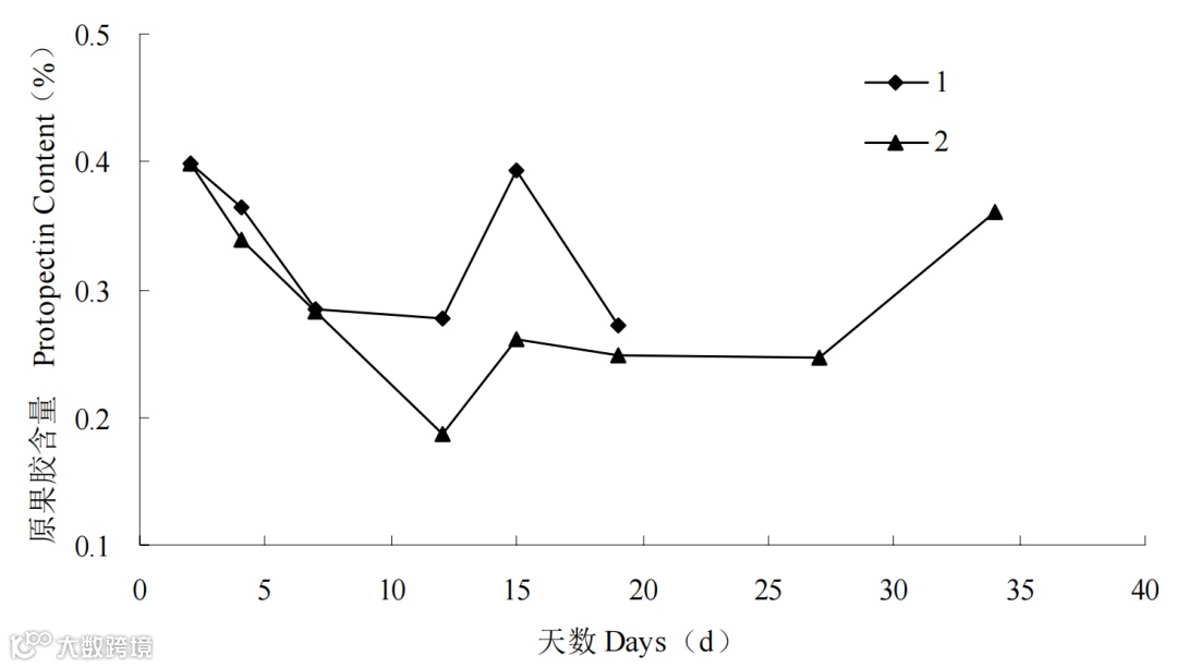 图 11 不同温度下莲雾果实原果胶含量变化(1:常温 (25℃) 2:低温 (5℃))