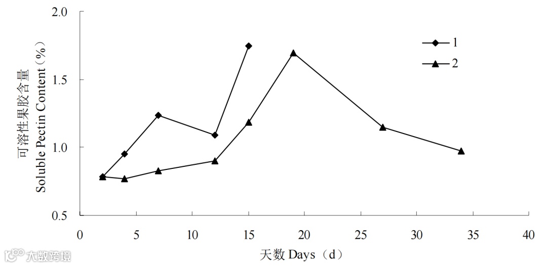 图 10 不同温度下莲雾果实可溶性果胶含量变化(1:常温 (25℃) 2:低温 (5℃))