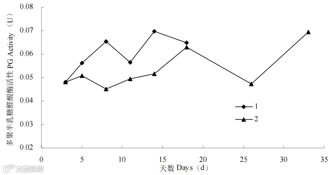 图 7 不同温度下莲雾果实多聚半乳糖醛酸酶(PG)活性变化(1:常温 (25℃) 2:低温 (5℃))