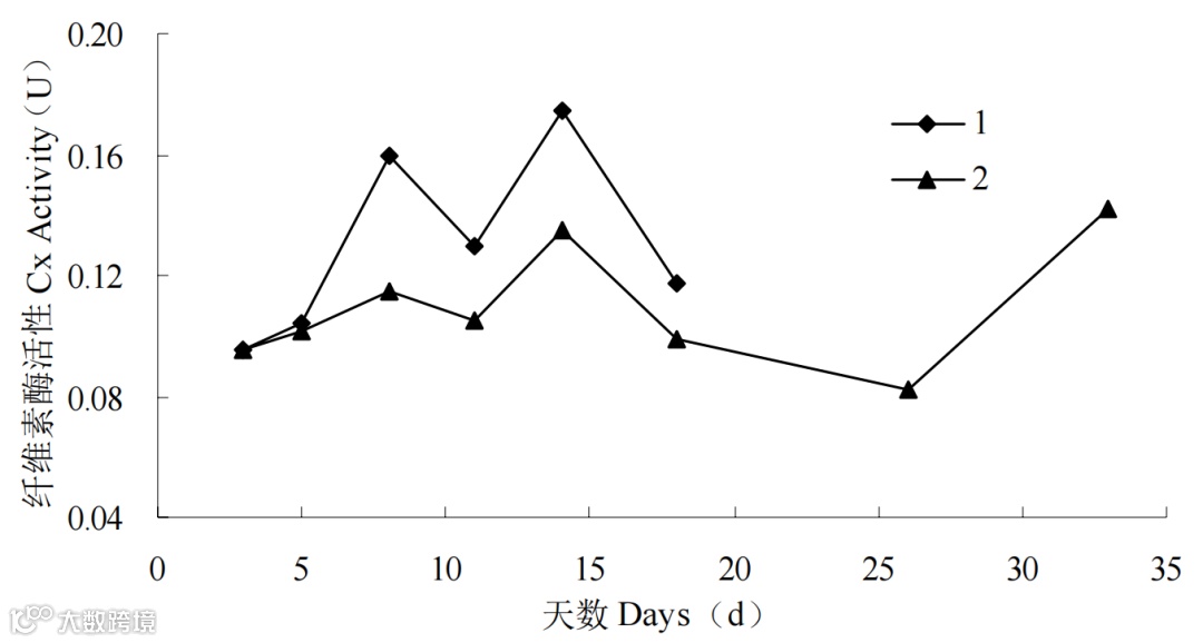 图 8 不同温度下莲雾果实纤维素酶(Cx)活性变化(1:常温 (25℃) 2:低温 (5℃))