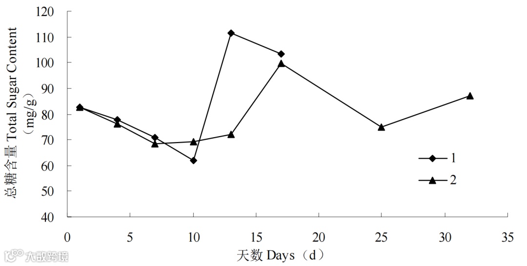 图 4 不同温度下莲雾果实中总糖含量的变化(1:常温 (25℃) 2:低温 (5℃))
