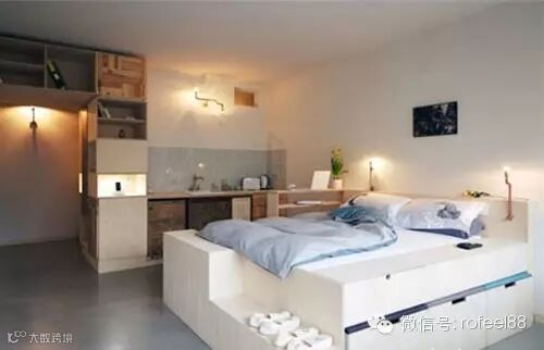 增高地台,使得开放式卧室与其他区域分隔开,再设计一些小台阶,这样的设计显得时尚而富有创意。