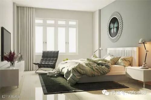 简单的墙面布置,只是刷上单一颜色的墙面漆,再挂两幅小画和一幅圆形的蝴蝶装饰画,这些简单的装饰使得卧室不浮华,让主人可以得到放松。