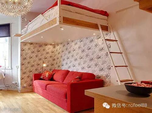 把卧室悬空设置在客厅沙发上面,通过加厚的木质和铝合金支架在底部作支撑,保证了卧室的安全性和隐私,更节省了空间。床架底部设置内嵌照明系统,为客厅提升了亮度。