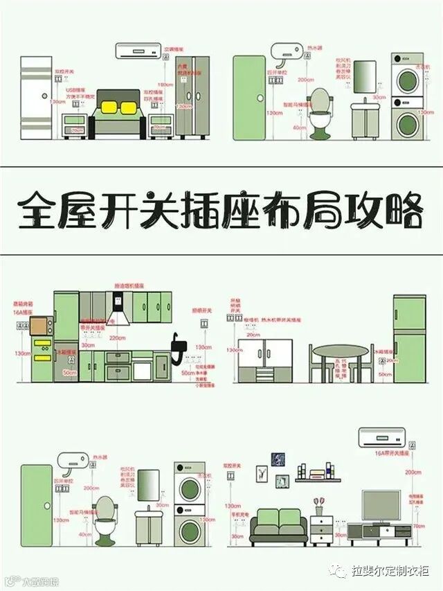拉斐尔全屋定制小编温馨提醒:这只是一个参考,大家可以根据自己家的使用习惯来布置。每个空间最好多预留1个插座,便于未来增加电器。