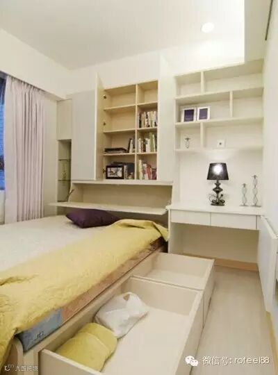同是巧妙利用了上下铺间的楼梯作收纳空间,连床头空间都没有放过。
