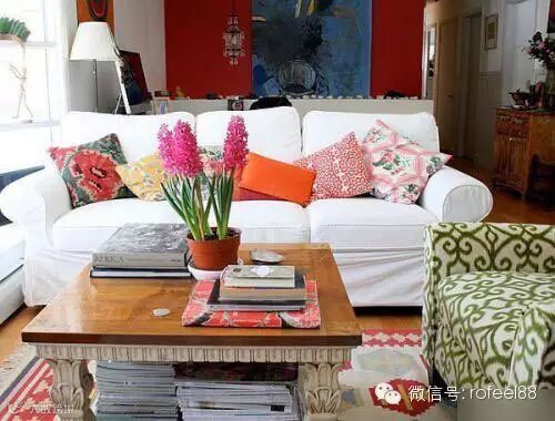 丰富的色彩出现在空间的各个角落,红色墙面与蓝色挂画、绿色布艺沙发、五颜六色的沙发抱枕,多种元素混搭让空间显得十分充实。
