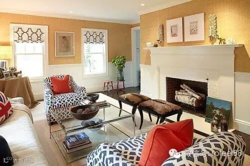 浅棕色麻质壁布给空间注入清新的乡村风,黑白纹理沙发与大红色抱枕搭配,让空间色彩更加丰富,同时又不会产生太强的视觉冲击力从而视觉疲劳。