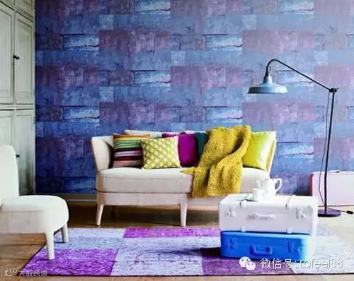 墙面紫色涂漆的粗糙质感显出大气的工业气息,沙发上的黄色抱枕十分鲜艳夺目,二者形成强烈对比,整个空间充满前卫色彩。