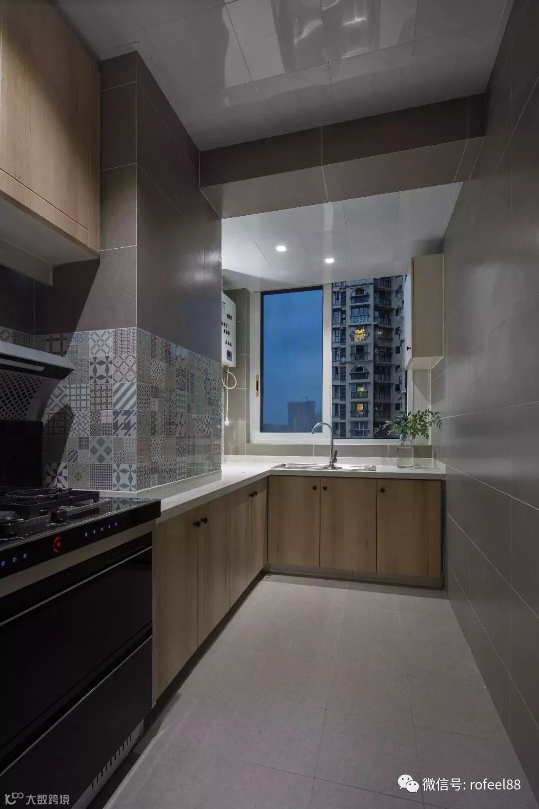 厨房的内部做了L形的橱柜布局方案,设计师以整体灰色调的瓷砖为主,搭配一些花砖和木色的橱柜来进行点缀,让厨房看起来很有格调。