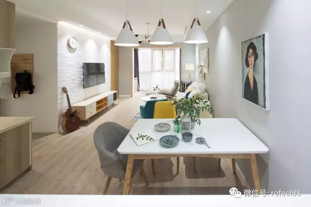 原木色和白色结合的餐桌椅,在浅灰色的背景墙的衬托之下,给人一种轻松、舒适的感觉。客餐厅之间不做隔断,也让空间显得更为宽敞和明亮。