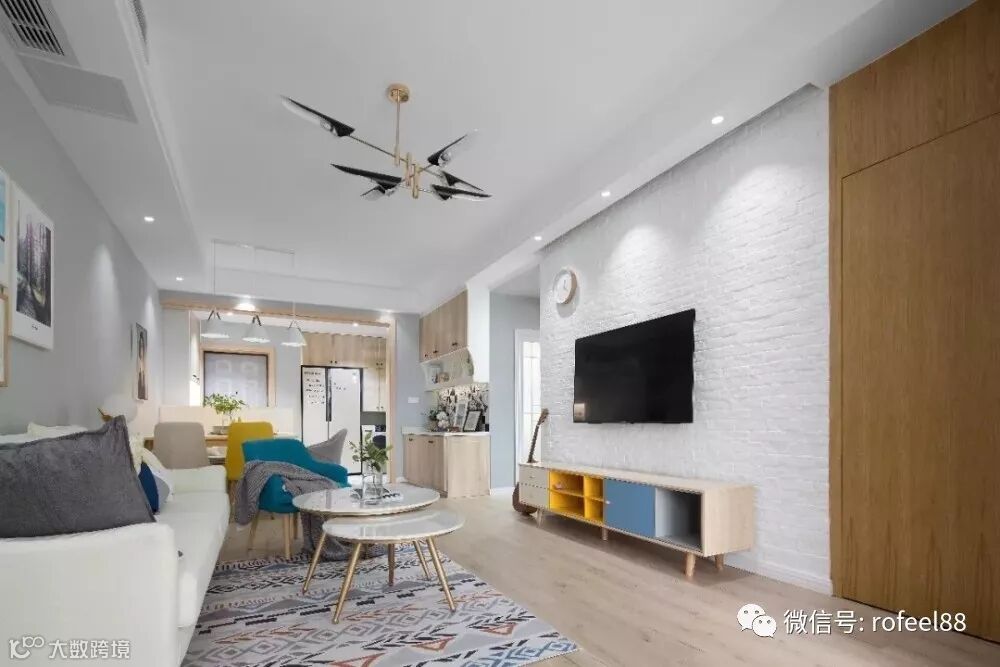 客厅的电视背景墙是做了文化砖的设计,侧方卧室的门被隐藏在了饰面板当中。黄色和蓝色相间的电视柜,让客厅变得更有活力,软装细节的设计非常关键。