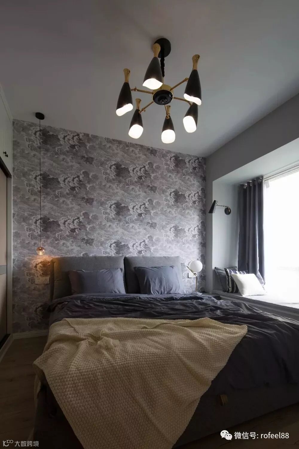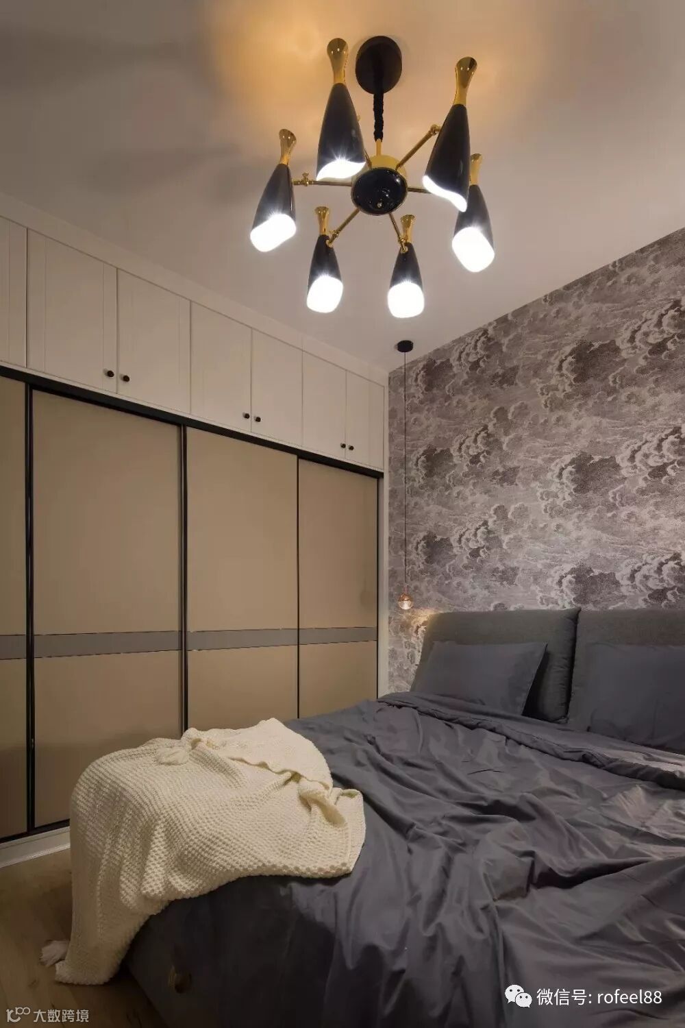 主卧室的床头背景墙是铺贴了花纹壁纸,这种深色的云朵花纹看起来也非常独特,整体软装的配色以灰色为主,让卧室看起来更加简洁大方。