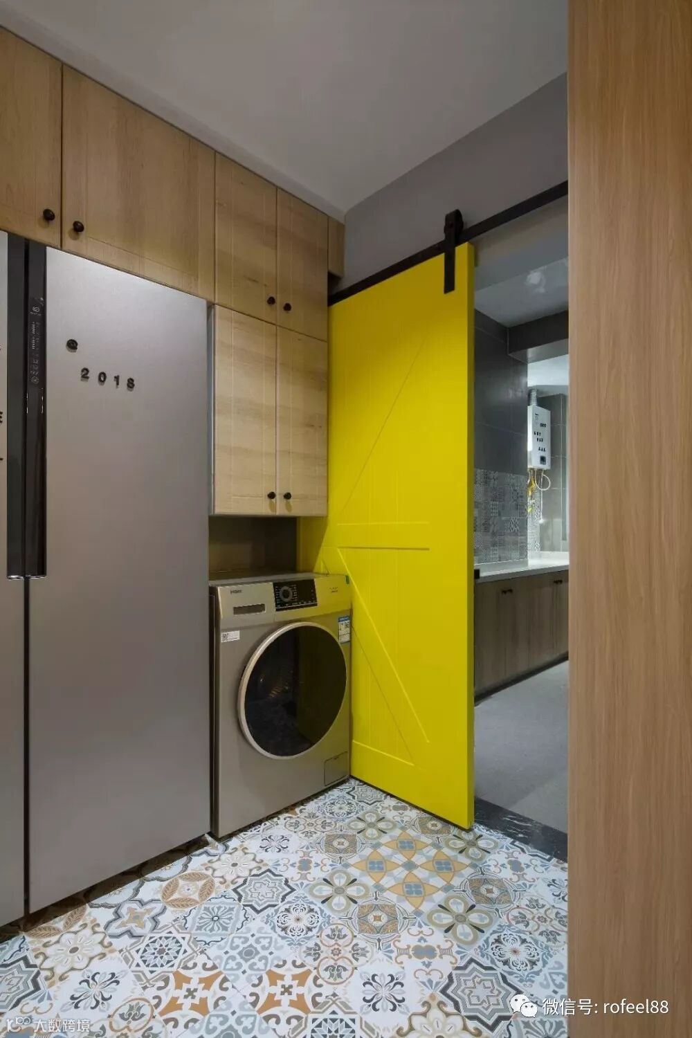 玄关走廊也连通了厨房空间,设计师选择把冰箱、洗衣机放在厨房的门外,亮黄色的谷仓门给这个空间增添了不少活力感。