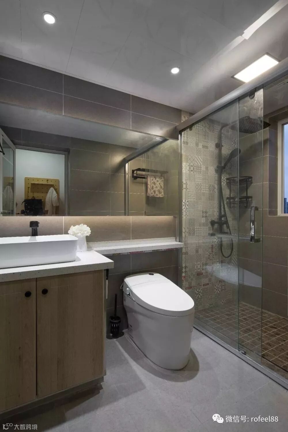 卫生间内做了干湿分离的设计,整个卫生间的面积本身就比较宽敞,洗手台、马桶和淋浴房的布局一点都不显得拥挤。把镜柜做到马桶的上方,拥有更多储物空间。