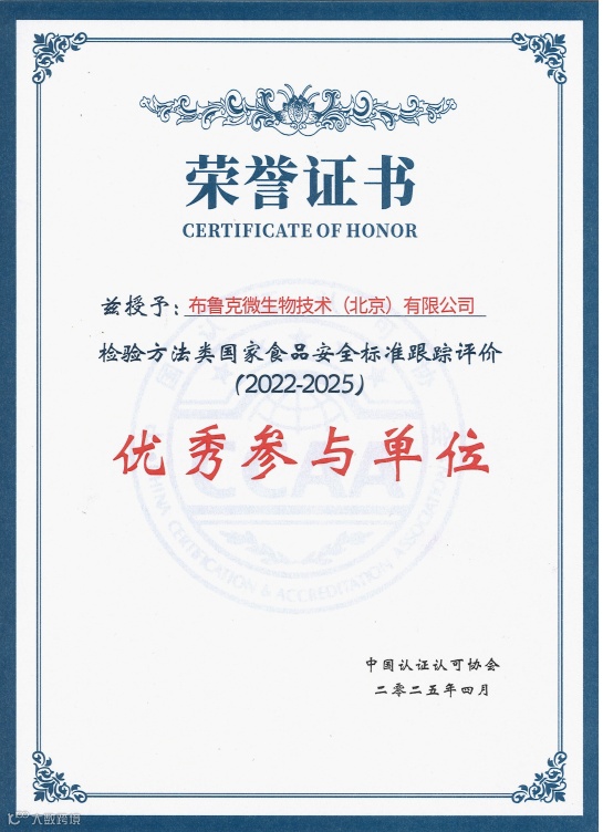 近日,在由中国认证认可协会组织的 “检验方法类食品安全国家标准跟踪评价(2022-2025)” 中,布鲁克微生物技术(北京)有限公司凭借在食品安全标准跟踪评价工作中的卓越表现,荣获 “优秀参与单位” 称号。该荣誉不仅是对布鲁克长期致力于食品安全检测技术创新与标准推动的高度认可,也是其在保障公众饮食安全方面所做出突出贡献的有力见证。