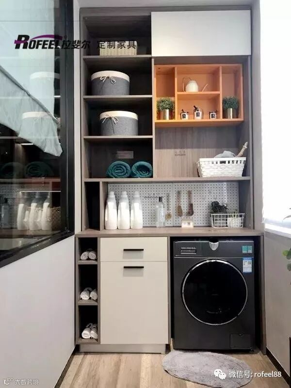 广州拉斐尔定制,让您的生活更美好!其实我们从上面的图片上看的出,洗衣机柜+开放收纳架也是在阳台不错的选择,开放式的收纳架顶部我们存放一些不太常用的物品,在台面上放一些常用的洗物用品,墙上挂钩我们可以挂小毛刷等,洗衣机柜左边安装了平开门式的储物柜,平时关上也是起到美观的作用。