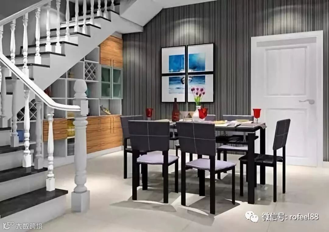 楼梯间有较深的空间,将其定制成一个容量较大的收纳空间,并不是什么难事,可以改造成了一个具有多隔层的收纳碗餐厅酒柜,正巧处于餐桌旁,带去了不少便捷。