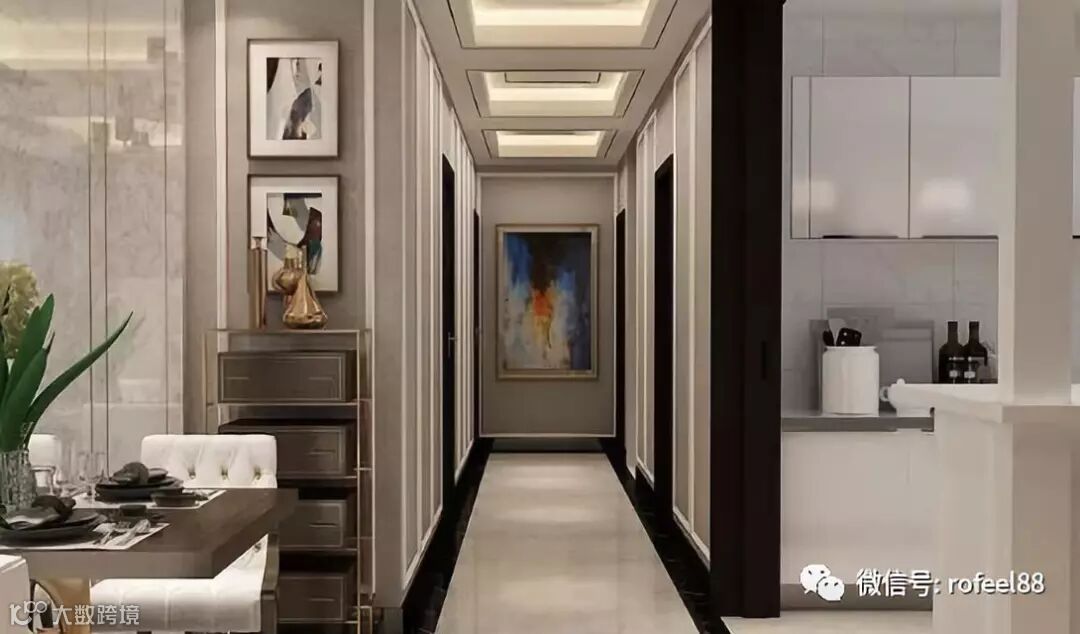 走廊式的入户玄关设计在户型布局中也算比较常见的玄关类型了,利用大门两边的其中一面墙做玄关,如果过道比较窄的话,一般这种走廊式的过道都是可以把墙体拆掉,拆掉之后就可以做嵌入式的玄关柜。不仅可以节省室内面积,储物空间还特别充足,整体效果也非常大气。