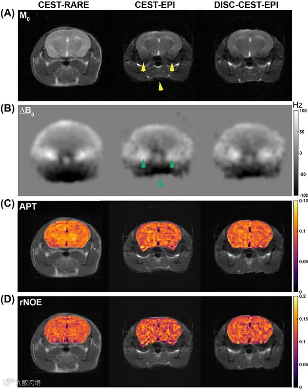 DISC-CEST-EPI技术可校正3T场强下CEST-EPI的失真现象,从而提升SSIM值并优化CEST定量分析。该方法有望在低场强MRI环境下显著改善单次激发CEST-EPI的成像质量与诊断准确性。然而,DISC-CEST-EPI在11.7 T场强下的性能表现受限,需进一步研发以增强其在超高场强环境下的应用效能。