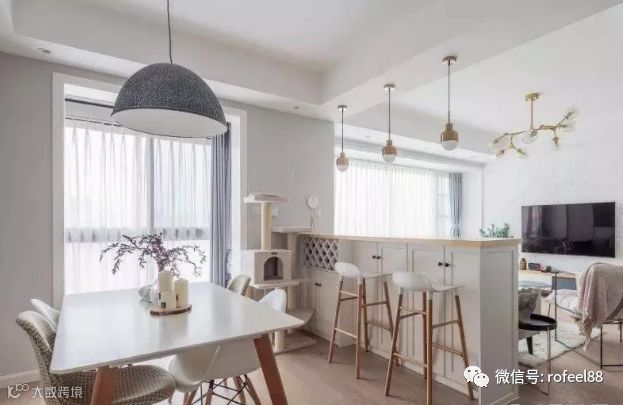 现在的户型大多都是进门就是厅,客人一进来就可以看到客餐厅的设计,如果不是特别小的户型,这两个厅的交界处都会有一定的过渡空间,而这个过渡空间若是留空的话则会显得空洞乏味,因此合理的设计这个过渡空间显得尤为重要,对于这两个不同功能的区间,如何设计才能美观又实用呢?