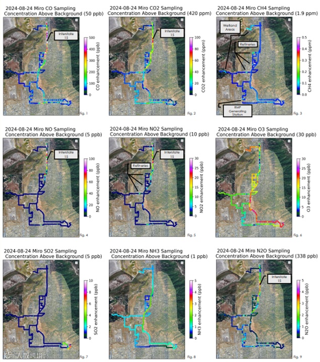 数据结果表明:气体的测量表现稳定,校准因子在多次校准中保持一致,仪器漂移极小,精度指标符合厂商说明,表现令人满意。通过多气体高时间同步测量结果绘制区域气体分布图,也有利于更好的探究区域排放详情以及污染源汇。