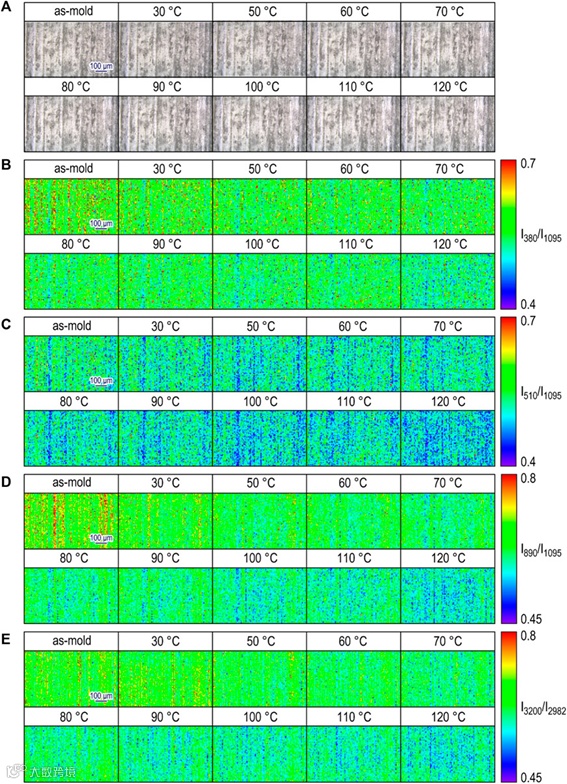 图3.(A)CNF 模塑件的原始模塑和磨损表面的光学图像,以及温升摩擦试验中各个温度下的(B) I380/I1095, (C) I510/I1095, (D) I890/I1095, and (E) I3200/I2982的原位拉曼成像图。