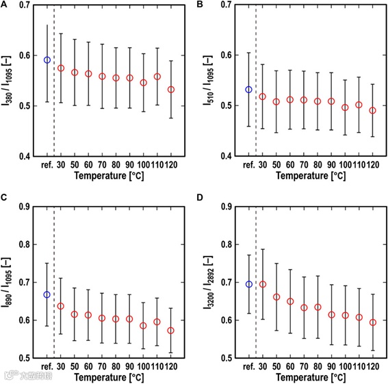 原位拉曼监测:拉曼特征峰峰高度比I370/I1057和I3200/I2892被用作CNF模塑表面结晶度的指标。I510/I1057和I891/I1057被用作CNF成型表面上COC糖苷链长度的指标。