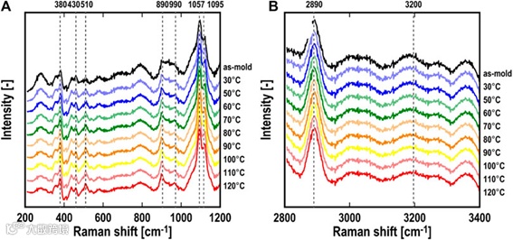 图2.(A)温升摩擦试验中每个温度下 200 至 1,200 cm -1的原位拉曼光谱,(B)温升摩擦试验中每个温度下 2,800 至 3,400 cm-1 的原位拉曼光谱。