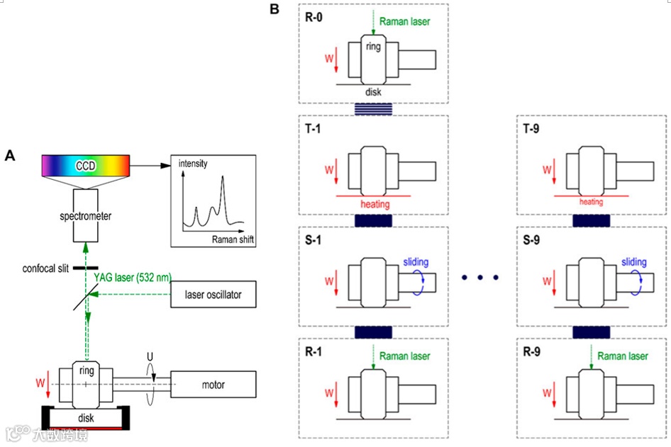 图1. (A) 用于观察摩擦过程的原位拉曼光谱装置的示意图,
