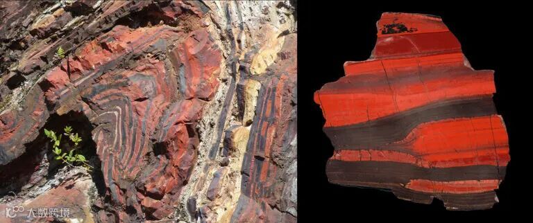 南非条带状铁矿露头(左)和露头的矿石样品(右)