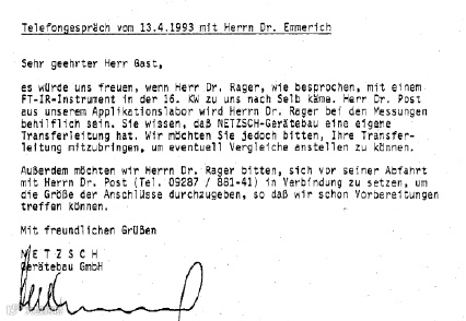 在随后的一次会议上,布鲁克公司总经理Gast先生和耐驰仪器公司总经理Emmerich博士决定在未来继续紧密合作。双方的努力贡献为热分析-红外光谱联用系统的优化及紧密成功合作奠定了基础。第一批深度定制的样板系统很快安装在布鲁克公司和耐驰公司,并且在1993年底举办了双方第一次联合研讨会。