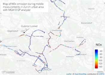 在测量期间,车辆在苏黎世周围行驶,并持续测量温室气体和污染物(包括二氧化氮)。通过这项工作,可识别出主要的排放源。