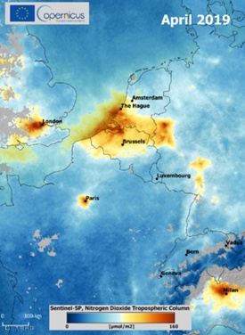 图3:哥白尼哨兵5P卫星于2019年4月观测的对流层二氧化氮柱浓度数据显示,荷兰的二氧化氮排放总量较高,导致了氮氧化物排放危机。