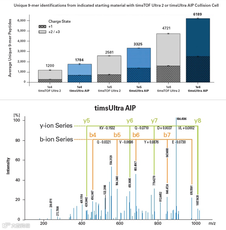 2025年布鲁克推出了timsUltra AIP超高灵敏度质谱平台,搭载全新AIP功能进一步优化了离子传输,显著提高碎片离子信号,获得更高的灵敏度和覆盖深度。相较于上一代timsTOF Ultra 2,免疫肽鉴定数目提升超过40%。低丰度样本的谱图质量更高。使用TIMS的多边形过滤技术,选中特定区域的电荷免疫肽进行检测鉴定,1e6个细胞就可以鉴定超过6100种9-mer免疫肽,实现单电荷免疫肽更高的检出能力。