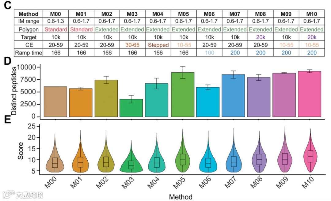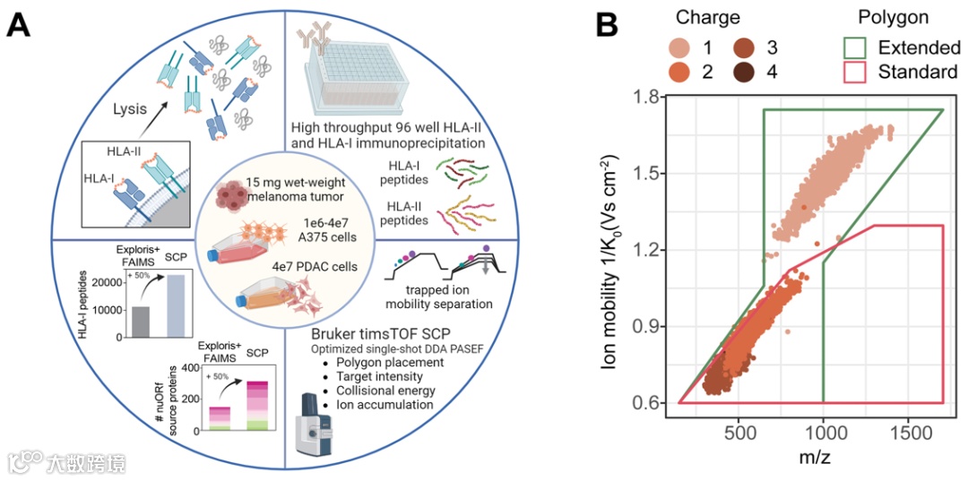 图3:(A)实验分析流程;(B)标准和优化后的多边形框对不同电荷价态免疫肽的覆盖;(C)timsTOF SCP 不同质谱方法的参数列表;(D)专属 HLA-I 免疫肽鉴定结果;(E)HLA-I 免疫肽相应得分分布