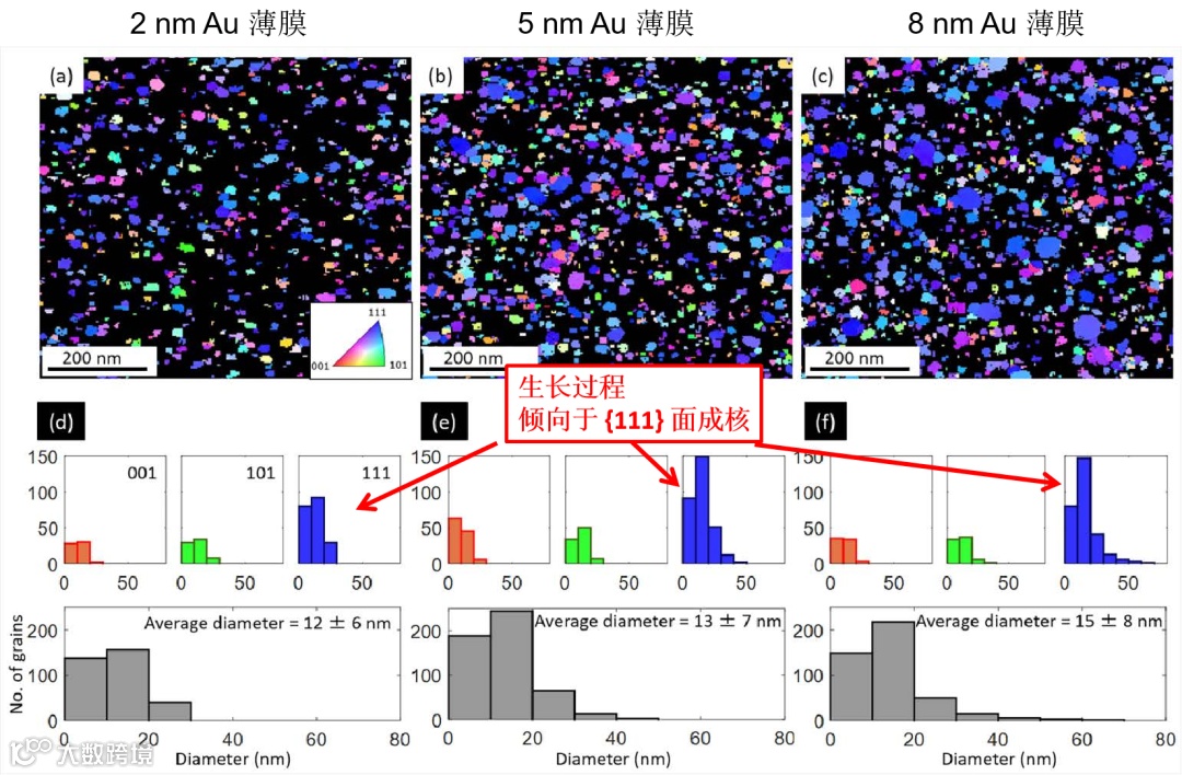 图3. Au/APS/SiO2 样品Au薄膜生长过程中的TKD取向分布图:薄膜厚度 (a) 2 nm (b) 5 nm和(c) 8 nm;(d-f) 晶粒尺寸及{001}, {101}和{111}取向分布统计图:薄膜厚度 (d) 2 nm (e) 5 nm和(f) 8 nm。