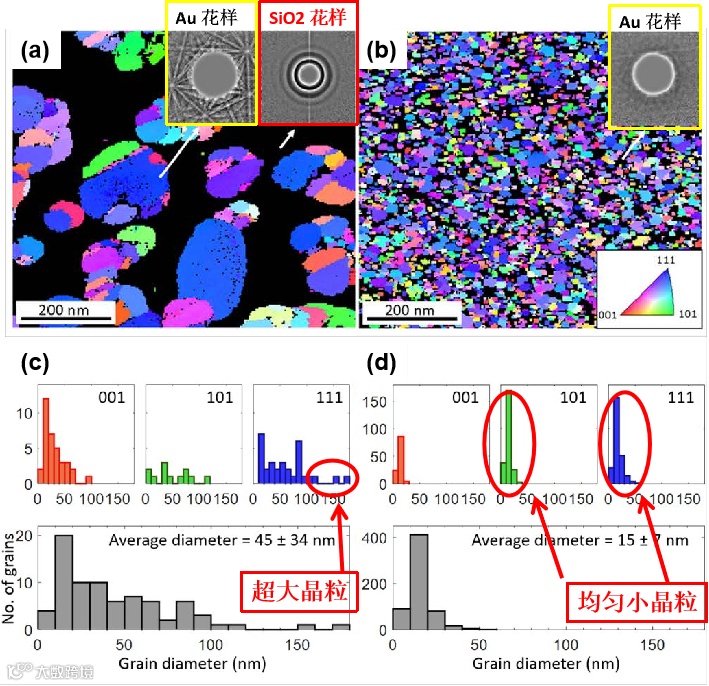 图2.TKD结果图:(a) Au/SiO2 (b) Au/APS/SiO2,右上角为衍射花样图;晶粒尺寸及{001}, {101}和{111}取向分布统计图:(c) Au/SiO2 (d) Au/APS/SiO2。