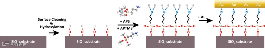 图1. sub-10 nm 金薄膜在SiO2 基底上面的制备过程示意图;其中有机分子APS 和APTMS 作为粘接剂。